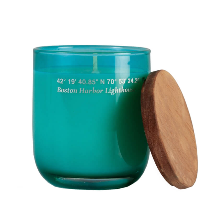 Vela de cera vegetal perfumada en tarro de cristal tintado y tapa de madera envejecida.